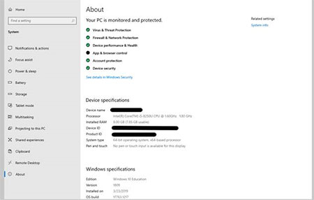 You can use the Settings application within Windows to check your hardware and software specifications by using these stpes: